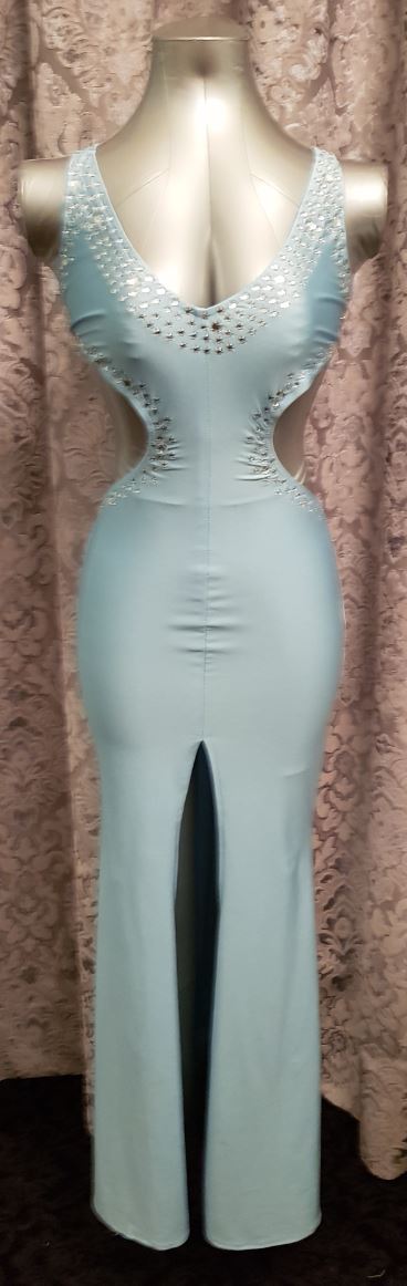 Rhinestone gown with open back and sides, and clasped backstrap.