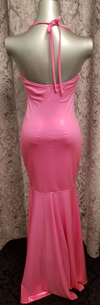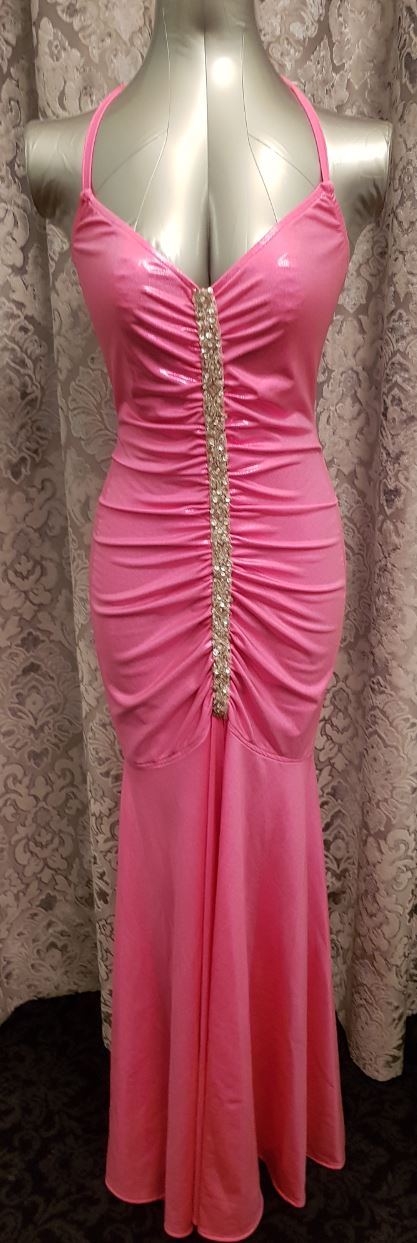 Shimmering gown with gathered front, rhinestone embellishment and open back.
