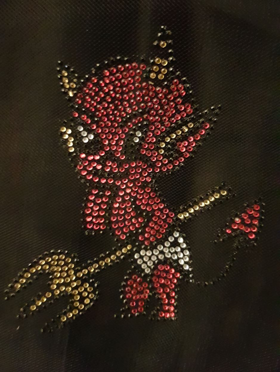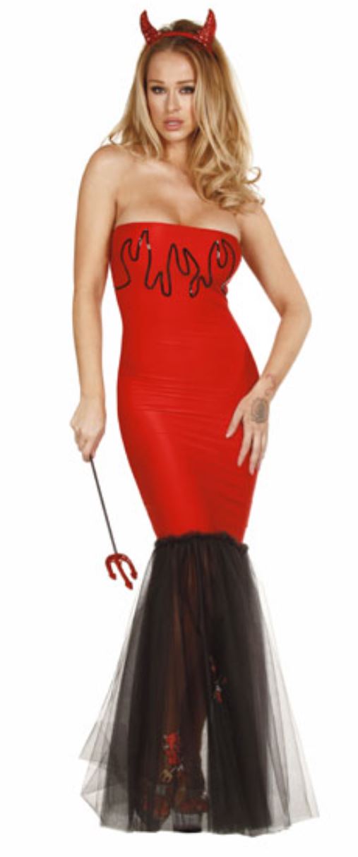 Long Devil dress with tulle hem and pitch fork welding devils and sequined pseudo flames.