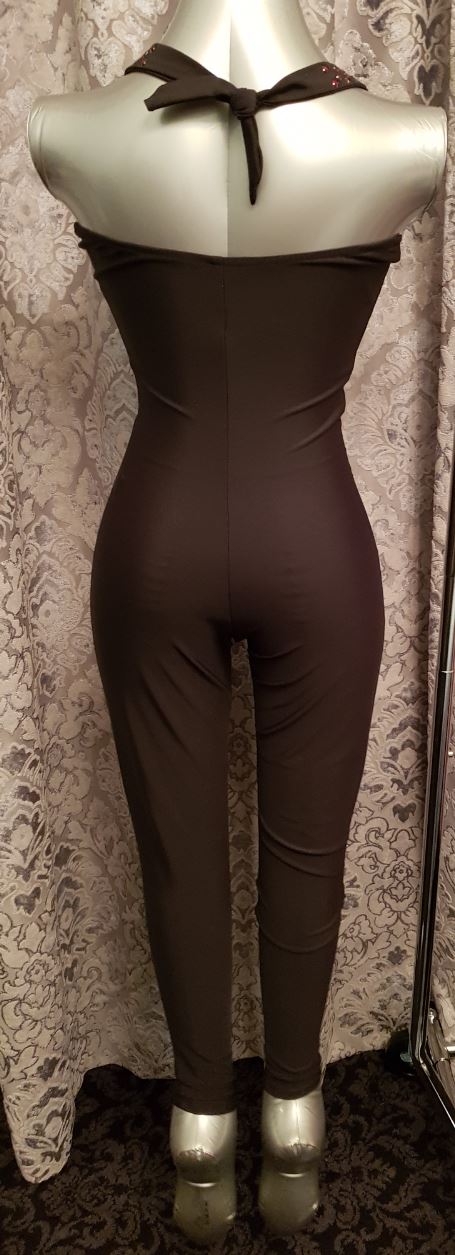 Zipper fronted devil jumpsuit with red crystal trim, tied at the neck.