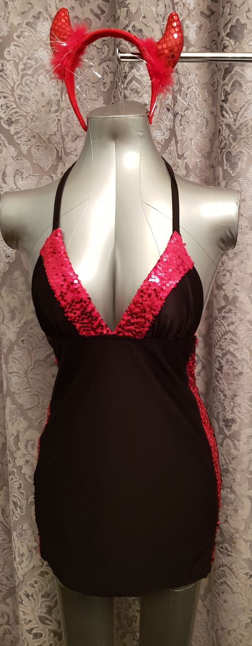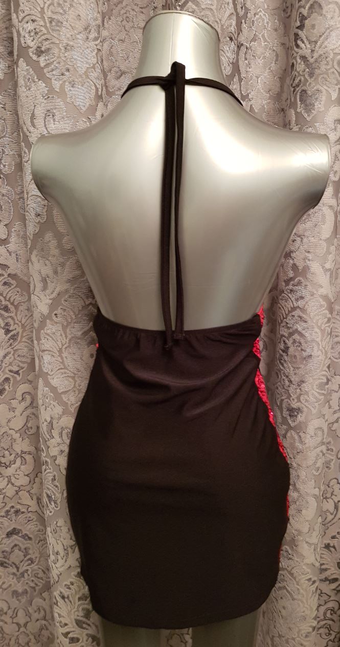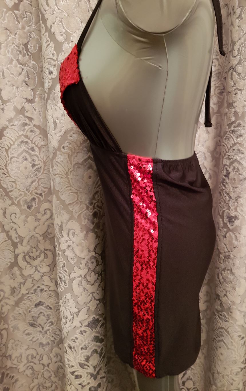 Devil minidress with red sequin detail, open back and tied at the neck.