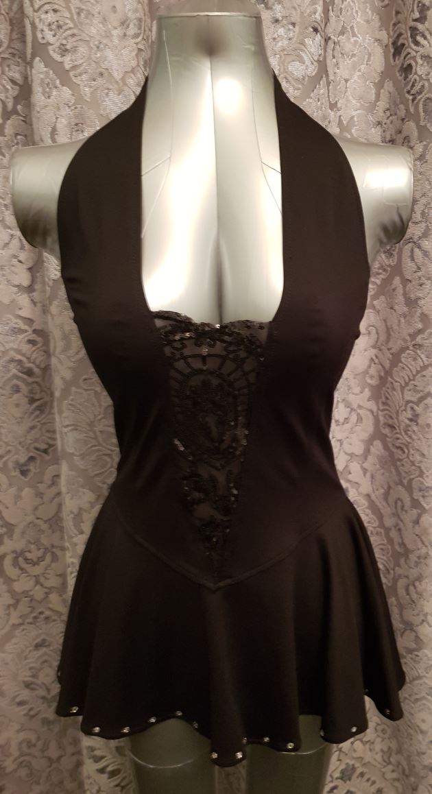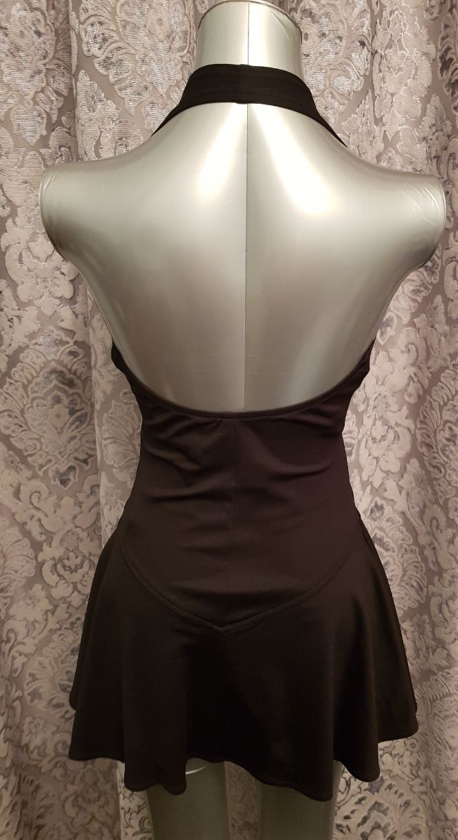 Flared short dress with laced plunging neckline and rhinestone trim.