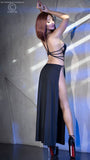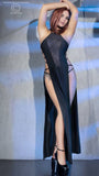 Club gown with shiny front panel, open sides and strappy open back. Matching G-string included.