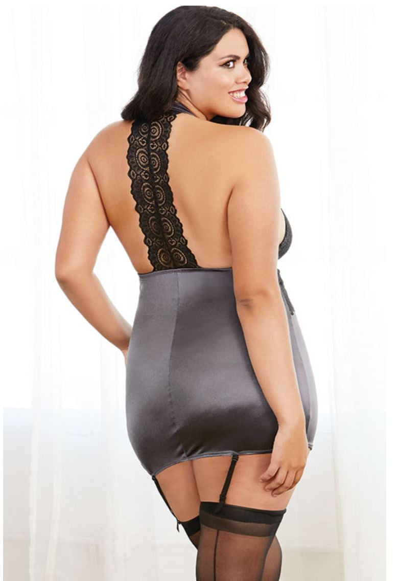 Removable garters. Material: Knit 94% Nylon, 6% Spandex. Lace 90% Nylon, 10% Spandex Colour: Slate SKU 12.10489 Size: 1X, 2X, 3X