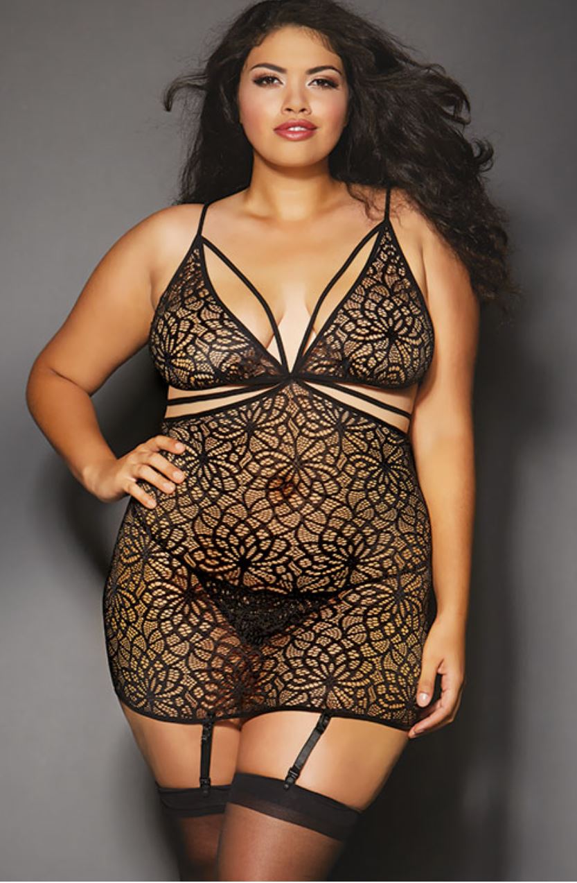 Dreamgirl mosaic lace chemise with garters and G-string.