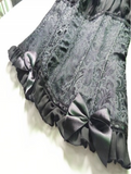 Embroidered design corset with ruffle trim and decorated with satin bows.
