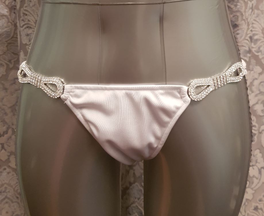 Double strap showgirl G-string with infinity crystal rhinestone.