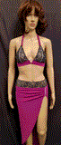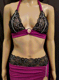 Long asymmetrical skirt with lace trim, rhinestone embellishments and matching bikini top.