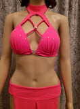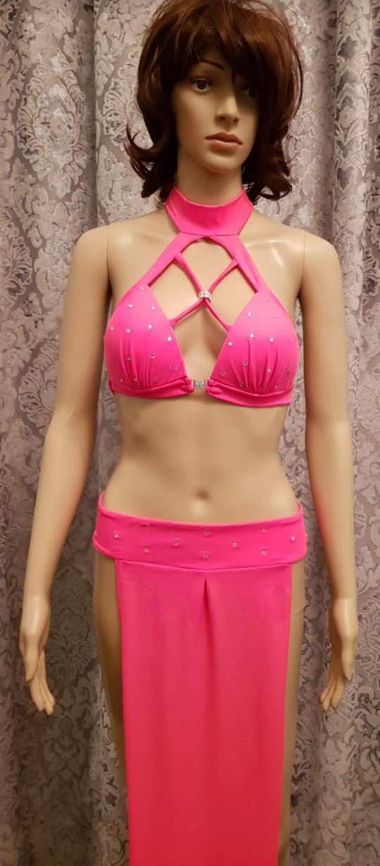 Long asymmetrical skirt with open sides and tied padded halter top with cross-over front.