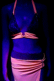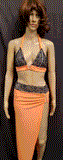 Long asymmetrical skirt with lace trim, rhinestone embellishments and matching bikini top.
