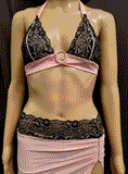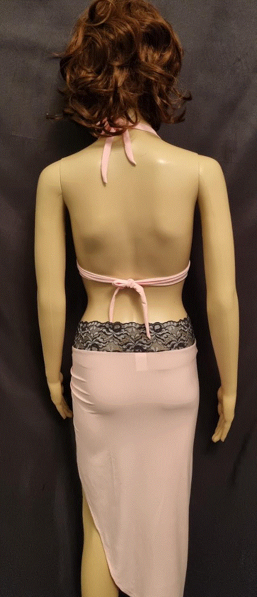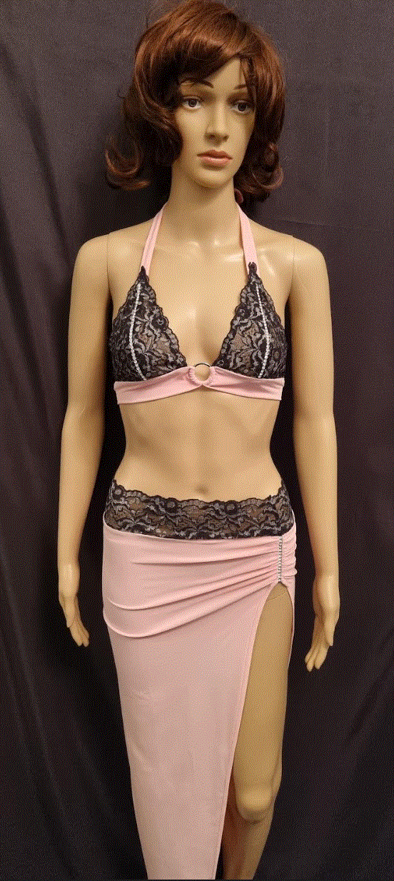 Long asymmetrical skirt with lace trim, rhinestone embellishments and matching bikini top.