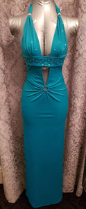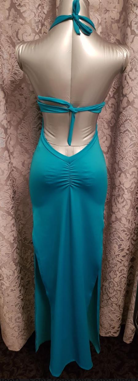 Gown with rhinestone studs, side splits on either side, keyhole front and open back.