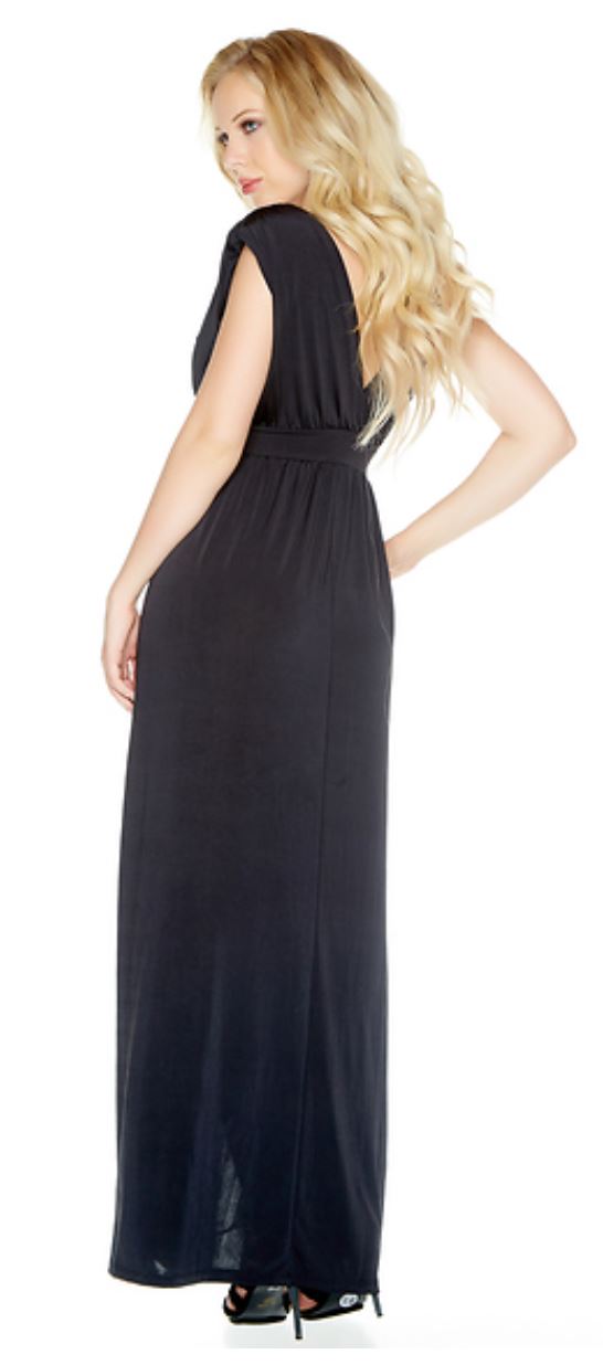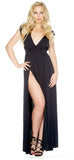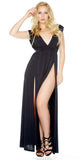 Impress in this elegant V-neck sleeveless gown with twin thigh-high splits and padded shoulders.