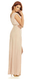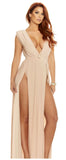 Impress in this elegant V-neck sleeveless gown with twin thigh-high splits and padded shoulders.