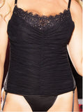 Rhinestone embellished, eyelash lace corset with padded underwired cups, tummy control panel with gathered mesh front, slimming boning, waist-cinching lace-up back, and wide adjustable shoulder straps and removable garters.