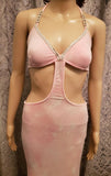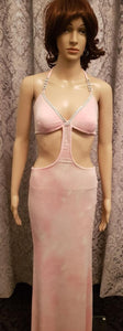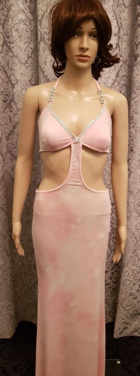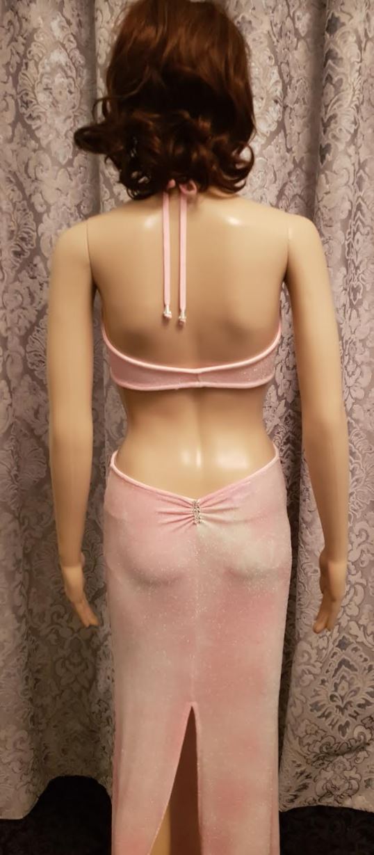 Long skirt and attached rhinestone top set in glitter silky finish, with open back and back split.