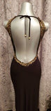 Keyhole gown with twin shoulder straps and sequins.