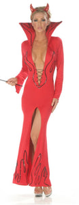 Long Devil dress with open laced front, high collar and sequined pseudo flames.