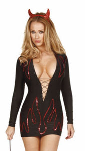 Devil long-sleeved minidress with open lace front, open back and sequined pseudo flames.