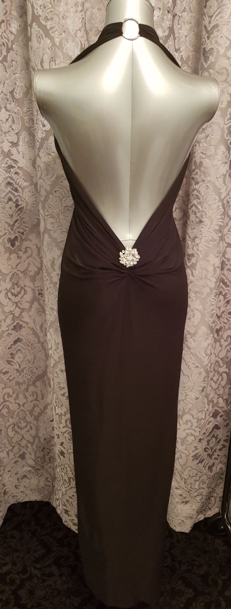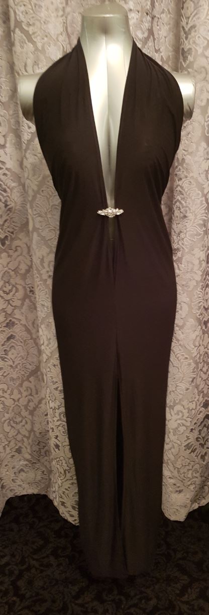 Backless gown with rhinestone brooch jewellery back and front.