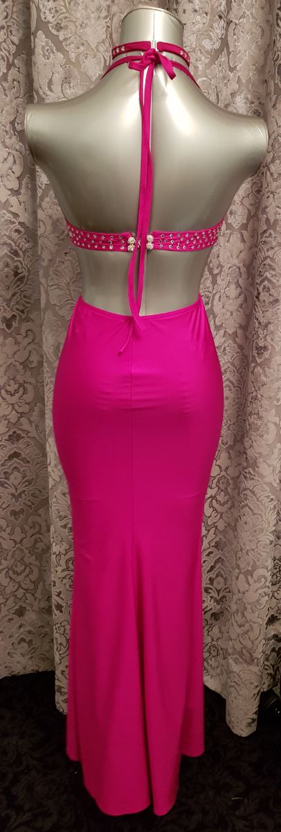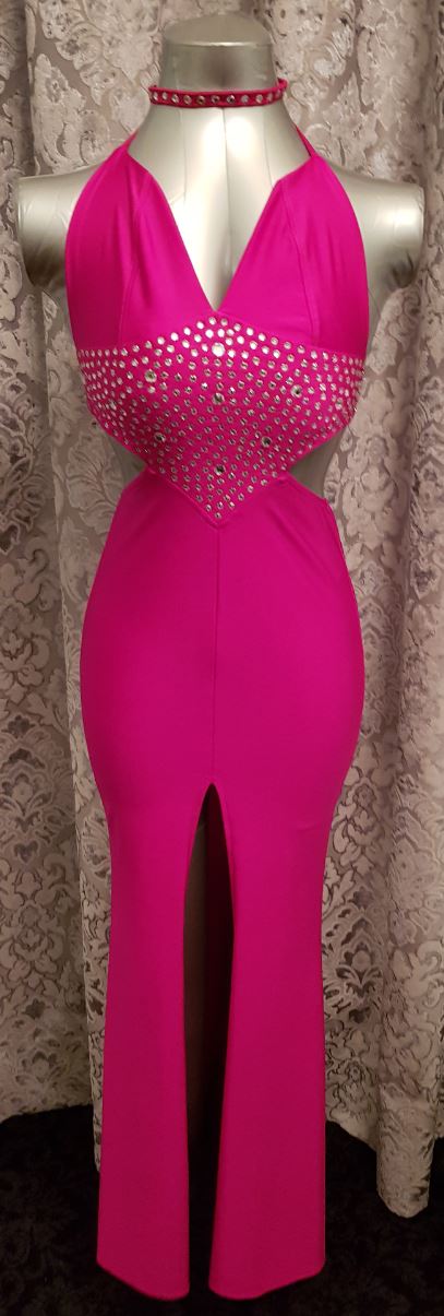 Rhinestone gown with open back and sides, and clasped back strap. Includes neck choker.