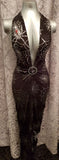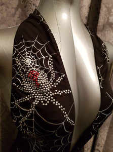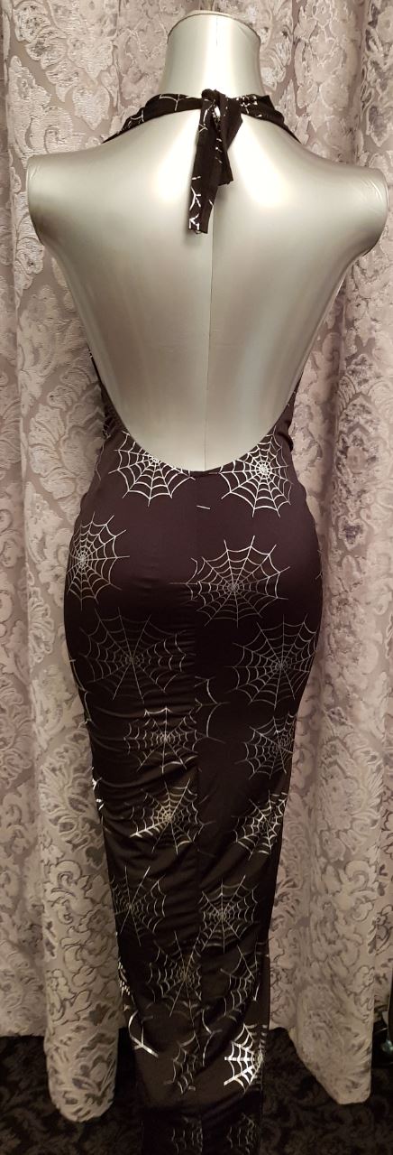 Halloween dress with plunging neckline to feature broach, sexy front split, tied at the neck with open back, and rich with spiderweb design and crystal spiders.