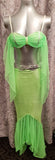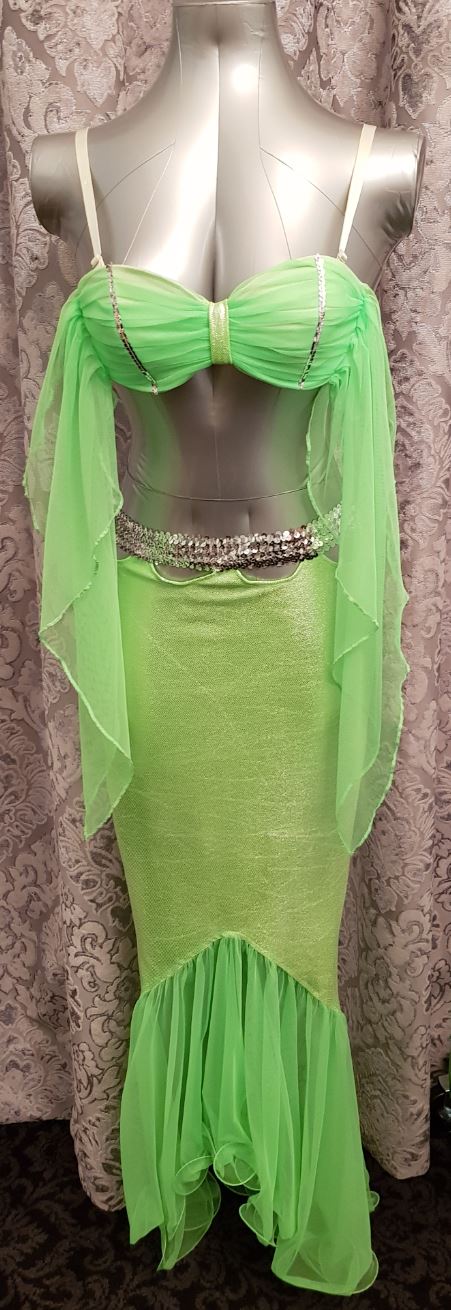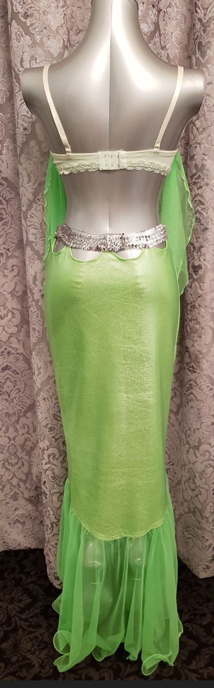 Mermaid skirt sequin waist and tulle hem. Includes separate padded bra with adjustable hook and eye closure.