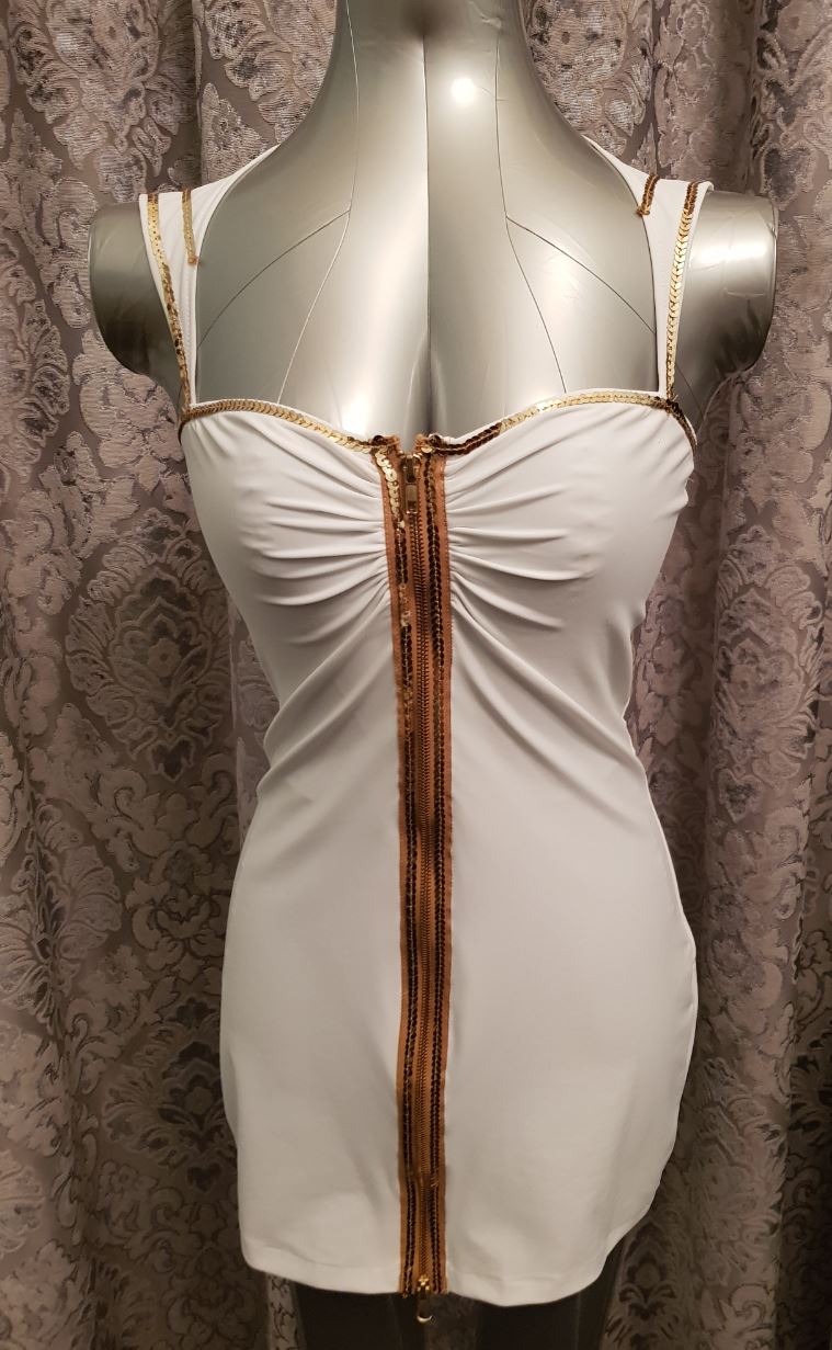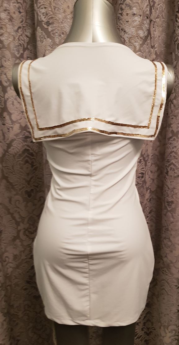 Sailor costume with full zipper front, gold sequin trim and sewn-in collar with traditional back square.