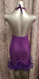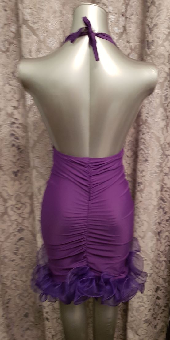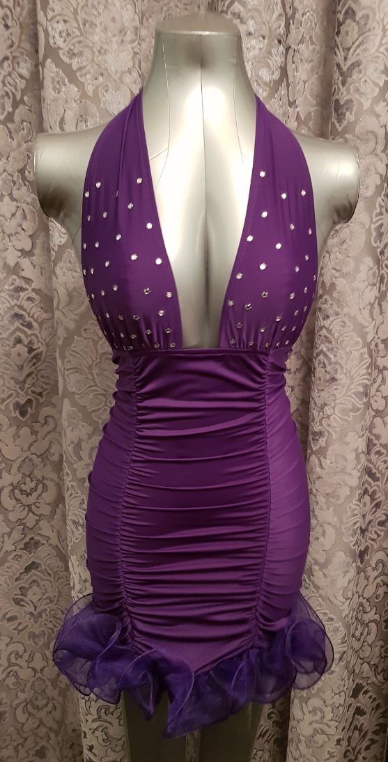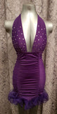 Short dress with gathered front and back, rhinestones and ruffle trim.