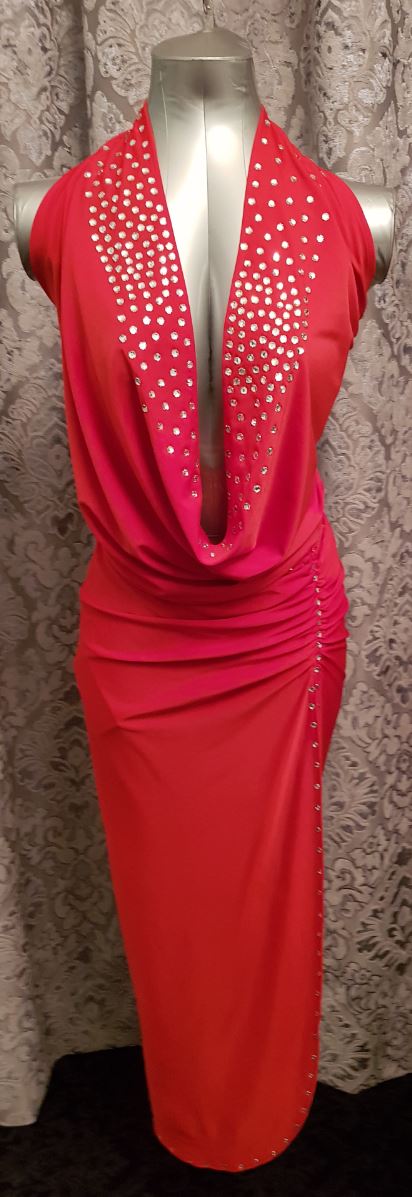 Skirt with deep plunging neck top and lavished in rhinestones.