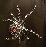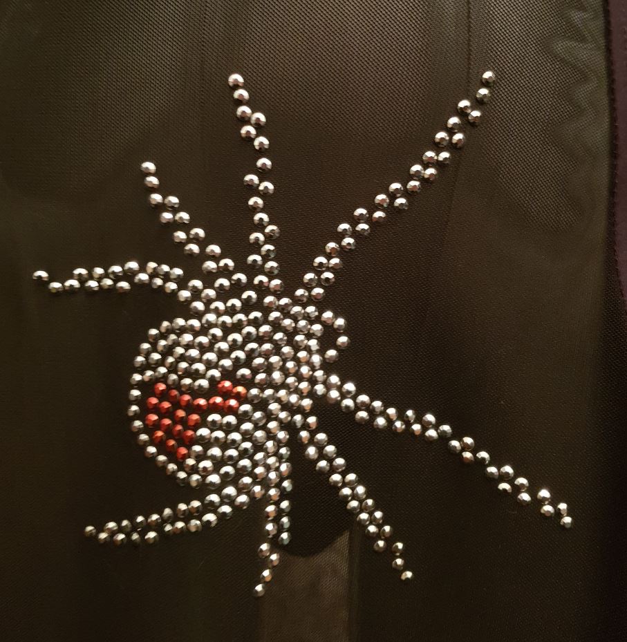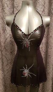 Halloween dress with semi-transparent front panel with crystal spiders, and solid back.