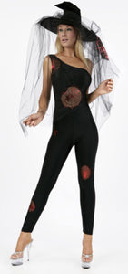 Witch one-shoulder jumpsuit with spiderweb and spiders design.