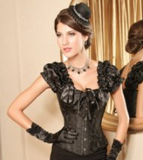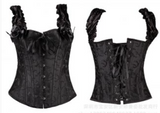 Ravishing boned corset has ruffle shoulder straps with ribbon bows.